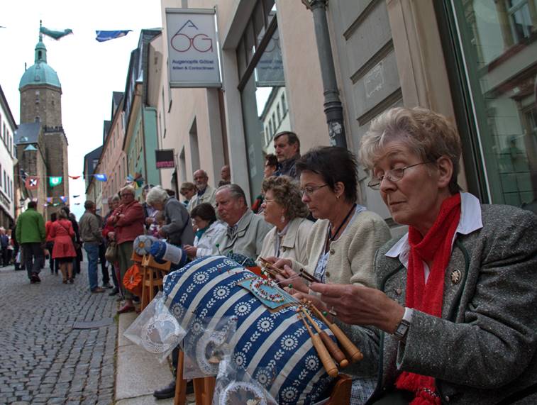 Großer Kirchgasse und Markt präsentierten Klöpplerinnen wie hier